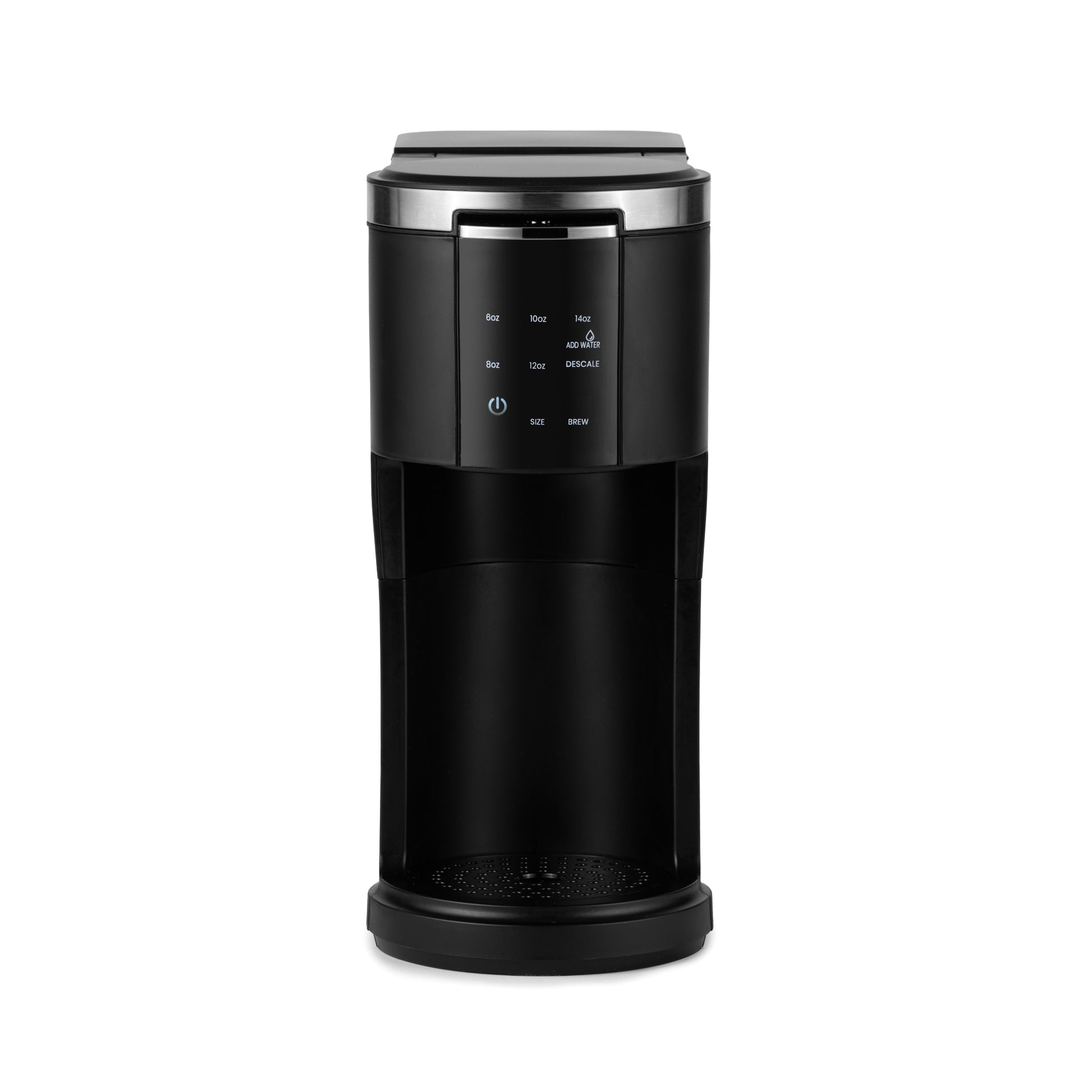 A compact 2-in-1 single serve coffee maker that brews in under 2 minutes, with touchscreen operation and support for both K-Cups and ground coffee.