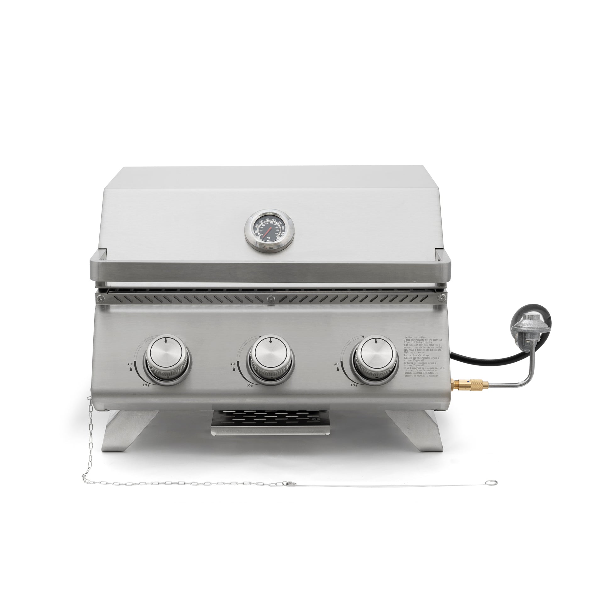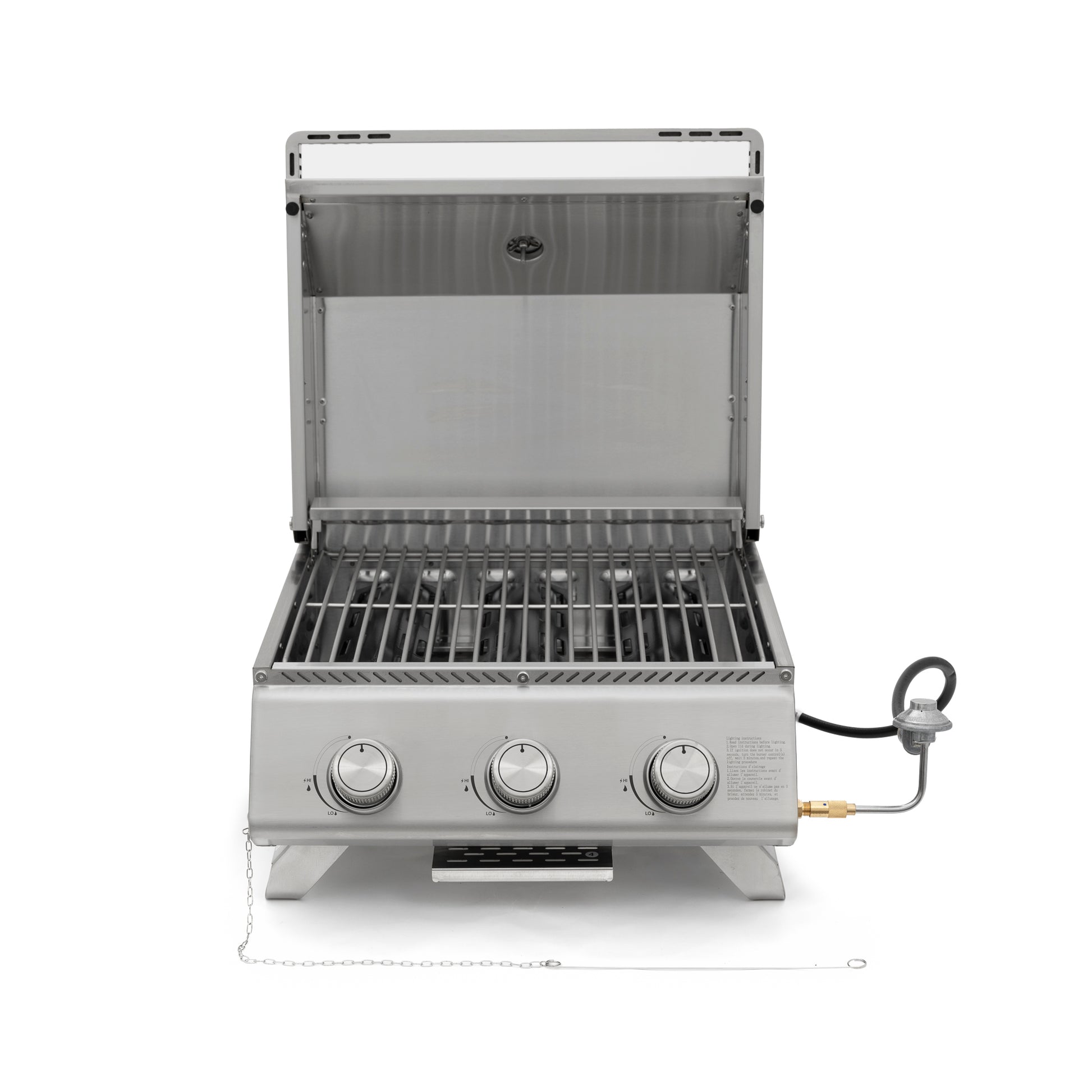 This portable tabletop propane grill delivers powerful performance with three stainless steel burners for a total of 24,000 BTU. Its compact design makes it easy to carry while still providing a generous cooking surface for meats, vegetables, or seafood. Built from durable stainless steel with a small footprint and a removable grill top, it’s perfect for backyards, balconies, camping trips, and outdoor gatherings.